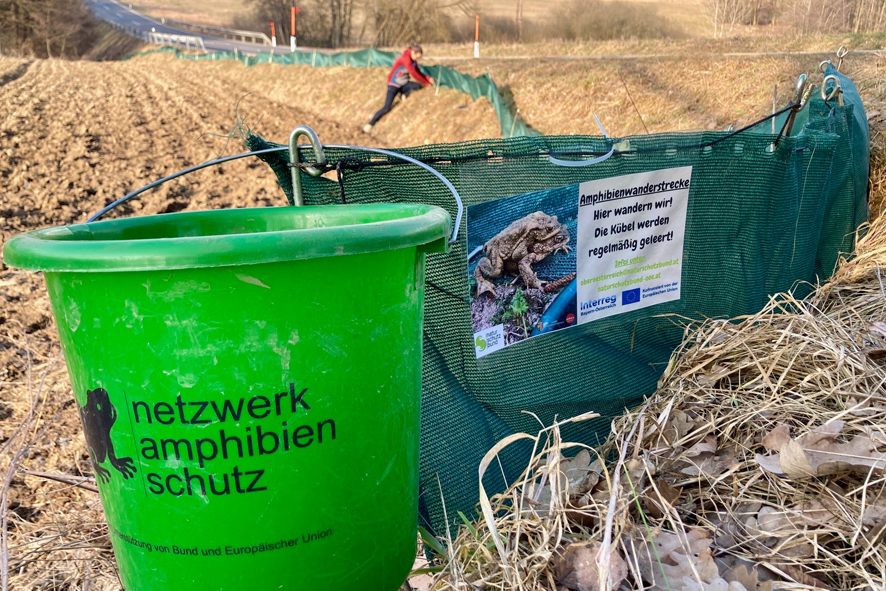 Jedes Jahr um diese Zeit wandern dort hunderte Amphibien, vor allem Erdkröten, aber auch Gras- und Springfrösche sowie Teichmolche aus dem Wald zum naheliegenden Teich über eine stark befahrene Straße. Damit die geschützten Tiere sicher das Gewässer zum Ablaichen erreichen, wandern sie entlang des Zaunes und fallen in Kübeln. Ein- bis zweimal täglich werden die Amphibien gezählt, nach Art und Geschlecht bestimmt und danach mit dem „Krötentaxi“ zum Teich gebracht.