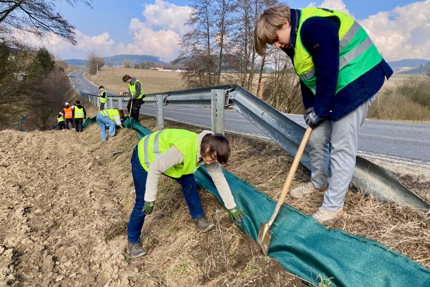 Voller Tatendrang und Jugendpower unterstützen zwölf Schüler der vierten AHWIL-Klasse BHAK.HTL.Freistadt mit ihrer Professorin Regina Mittmannsgruber und ihrem Professor Harald Tutsch im Rahmen des Naturwissenschaftlichen Unterrichts den Naturschutzbund Oberösterreich beim Aufstellen eines 250 Meter langen Amphibienschutzzaunes in Selker, Gemeinde Pregarten im Bezirk Freistadt am 4. März 2026. Kräftig mit angepackt hat auch Bürgermeister Fritz Robeischl, der die fleißigen Froschretter:innen darüber hinaus mit einer Jause und Getränken versorgte.
