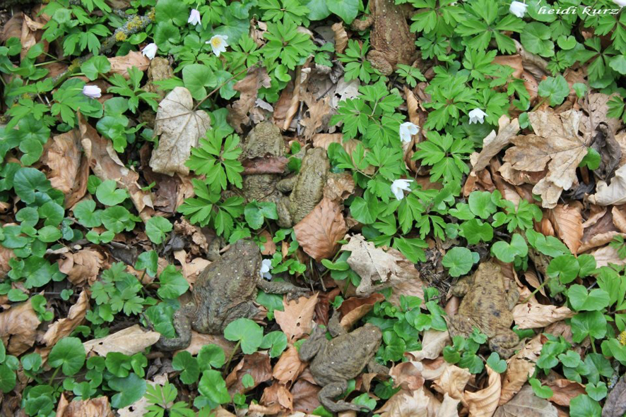 | Foto: Amphibien wie die Erdkröte halten Winterstarre. © H. Kurz | Foto: Erdkröten wandern im März zu ihren Laichgewässern. © H. Kurz | Foto: Amphibienschutzzäune retten vielen Erdkröten das Leben. © H. Kurz |