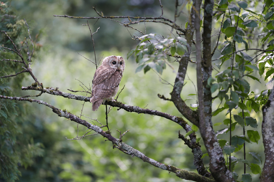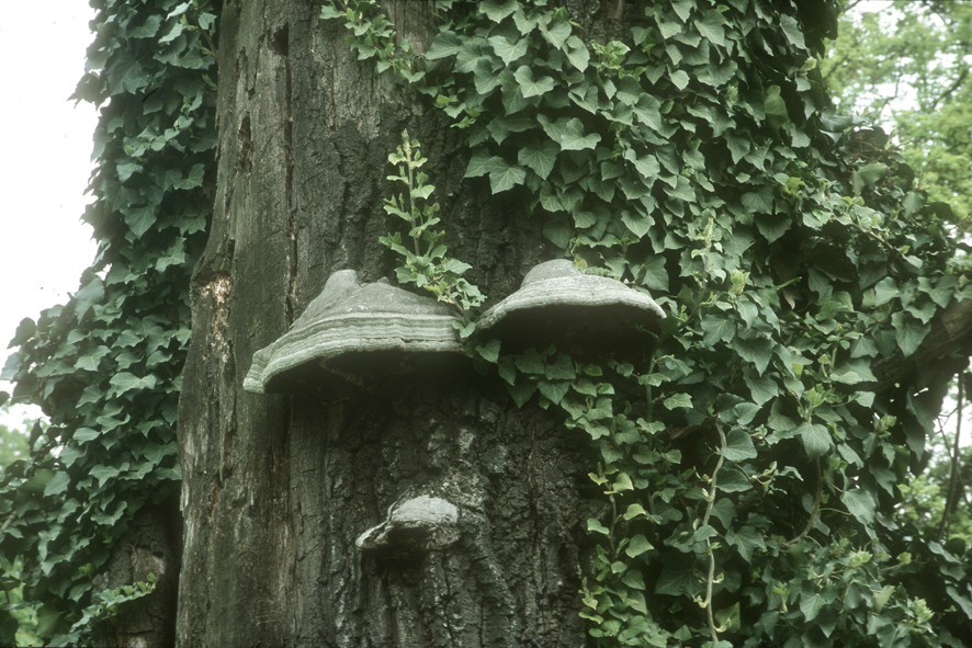 Fotos: Waldkäuze bewohnen höhlenreiche Bäume; © D. Einsiedler Efeubewuchs bietet Lebensraum und Nahrung. © J. Limberger Buntspecht-Männchen mit Eichel; © B. Rosenberger