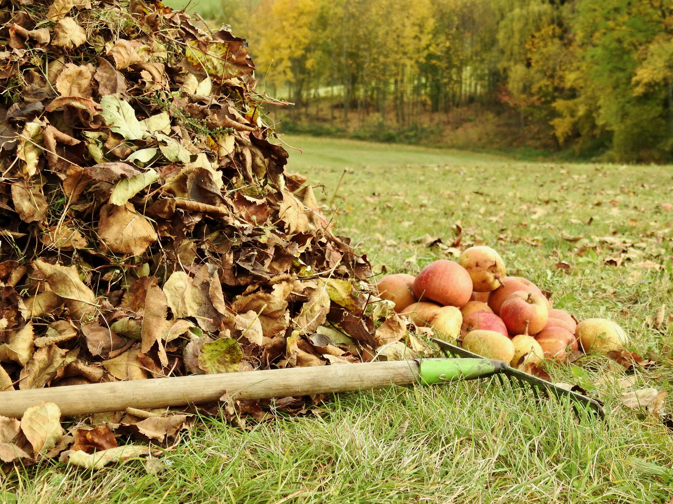 Mit dem Rechen Laub und Reisig zu einem Haufen aufschichten